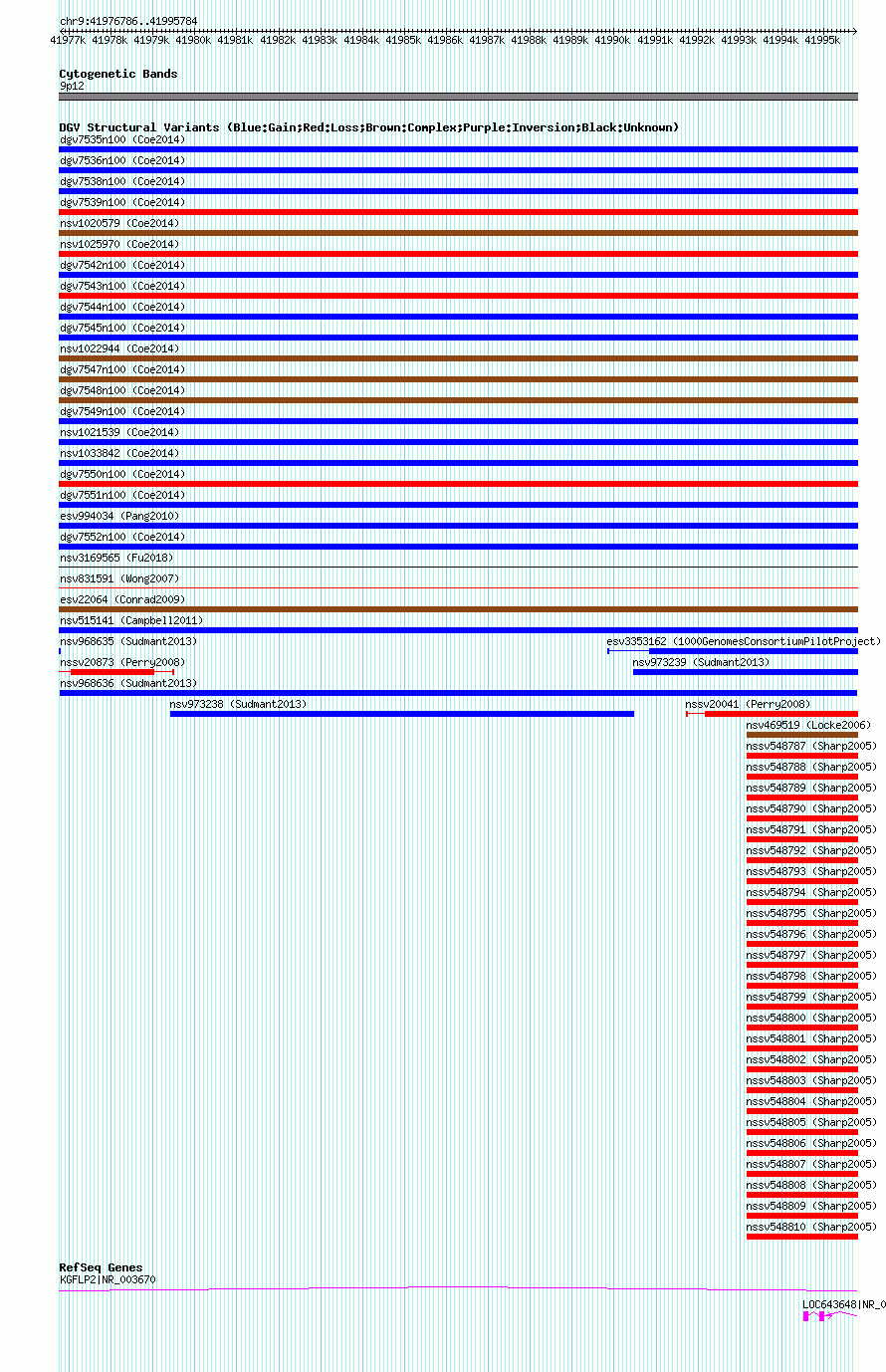 Variant DetailsVariant: nsv968636| Internal ID | 18603864 | | Landmark | | | Location Information | | | Cytoband | 9p12 | | Allele length | | Assembly | Allele length | | hg38 | 18999 | | hg19 | 18999 | | hg18 | 18999 |
