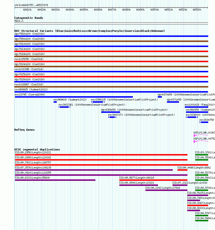 |  | Variant Type | CNV duplication |  | Copy Number |  |  | Allele State |  |  | Allele Origin |  |  | Probe Count |  |  | Validation Flag |  |  | Merged Status | M |  | Merged Variants |  |  | Supporting Variants | nssv2544173, nssv2544179, nssv2544176, nssv2544174, nssv2544182, nssv2544180, nssv2544175, nssv2544178, nssv2544181, nssv2544177 |  | Samples | HGDP01284, HGDP00665, HGDP00998, HGDP00521, HGDP00778, HGDP01307, HGDP00542, HGDP01029, HGDP00456, HGDP00927 |  | Known Genes | KGFLP1 |  | Method | Sequencing |  | Analysis | lineage specific fixed duplications |  | Platform | Not reported |  | Comments |  |  | Reference | Sudmant_et_al_2013 |  | Pubmed ID | 23825009 |  | Accession Number(s) | nsv968665