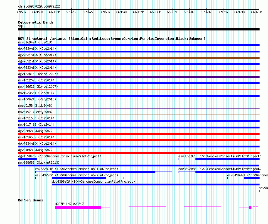 Variant DetailsVariant: nsv968682| Internal ID | 18603910 | | Landmark | | | Location Information | | | Cytoband | 9q12 | | Allele length | | Assembly | Allele length | | hg38 | 14294 | | hg19 | 14294 | | hg18 | 14294 |