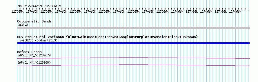 | | Variant Type | CNV duplication | | Copy Number | | | Allele State | | | Allele Origin | | | Probe Count | | | Validation Flag | | | Merged Status | M | | Merged Variants | | | Supporting Variants | nssv2567437, nssv2567436, nssv2567431, nssv2567430, nssv2567433, nssv2567429, nssv2567434, nssv2567438, nssv2567432, nssv2567435 | | Samples | HGDP01284, HGDP00665, HGDP00998, HGDP00521, HGDP00778, HGDP01307, HGDP00542, HGDP01029, HGDP00456, HGDP00927 | | Known Genes | GAPVD1 | | Method | Sequencing | | Analysis | lineage specific fixed duplications | | Platform | Not reported | | Comments | | | Reference | Sudmant_et_al_2013 | | Pubmed ID | 23825009 | | Accession Number(s) | nsv968753