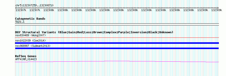 | | Variant Type | CNV duplication | | Copy Number | | | Allele State | | | Allele Origin | | | Probe Count | | | Validation Flag | | | Merged Status | M | | Merged Variants | | | Supporting Variants | nssv2375422, nssv2375417, nssv2375416, nssv2375418, nssv2375419, nssv2375420, nssv2375421, nssv2375423, nssv2375424, nssv2375425 | | Samples | HGDP01284, HGDP00665, HGDP00998, HGDP00521, HGDP00778, HGDP01307, HGDP00542, HGDP01029, HGDP00456, HGDP00927 | | Known Genes | AFF4 | | Method | Sequencing | | Analysis | lineage specific fixed duplications | | Platform | Not reported | | Comments | | | Reference | Sudmant_et_al_2013 | | Pubmed ID | 23825009 | | Accession Number(s) | nsv968987