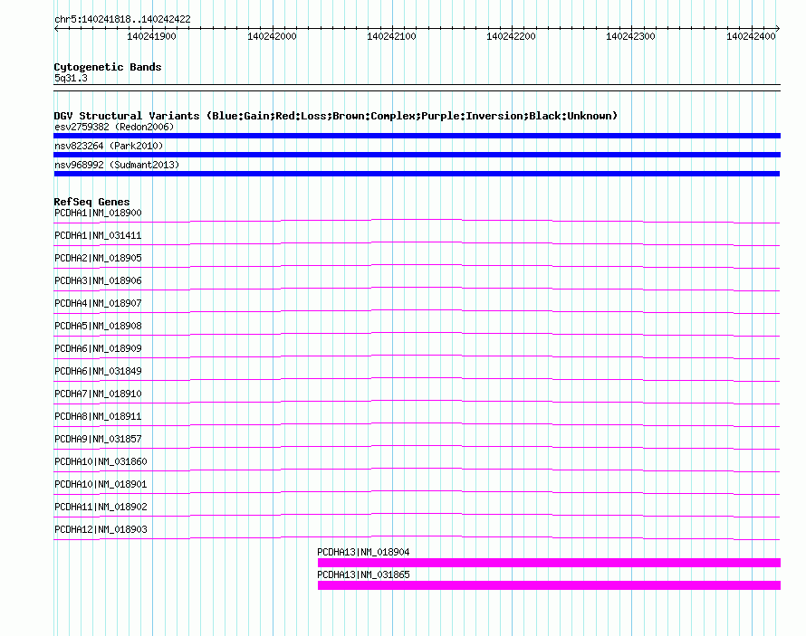 | | Variant Type | CNV duplication | | Copy Number | | | Allele State | | | Allele Origin | | | Probe Count | | | Validation Flag | | | Merged Status | M | | Merged Variants | | | Supporting Variants | nssv2379746, nssv2379747, nssv2379738, nssv2379741, nssv2379744, nssv2379743, nssv2379745, nssv2379739, nssv2379742, nssv2379740 | | Samples | HGDP01284, HGDP00665, HGDP00998, HGDP00521, HGDP00778, HGDP01307, HGDP00542, HGDP01029, HGDP00456, HGDP00927 | | Known Genes | PCDHA1, PCDHA10, PCDHA11, PCDHA12, PCDHA13, PCDHA2, PCDHA3, PCDHA4, PCDHA5, PCDHA6, PCDHA7, PCDHA8, PCDHA9 | | Method | Sequencing | | Analysis | lineage specific fixed duplications | | Platform | Not reported | | Comments | | | Reference | Sudmant_et_al_2013 | | Pubmed ID | 23825009 | | Accession Number(s) | nsv968992