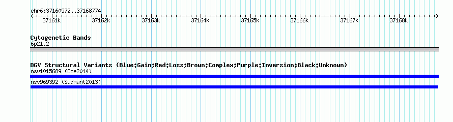 Variant DetailsVariant: nsv969392| Internal ID | 18604619 | | Landmark | | | Location Information | | | Cytoband | 6p21.2 | | Allele length | | Assembly | Allele length | | hg38 | 8203 | | hg19 | 8203 | | hg18 | 8203 |