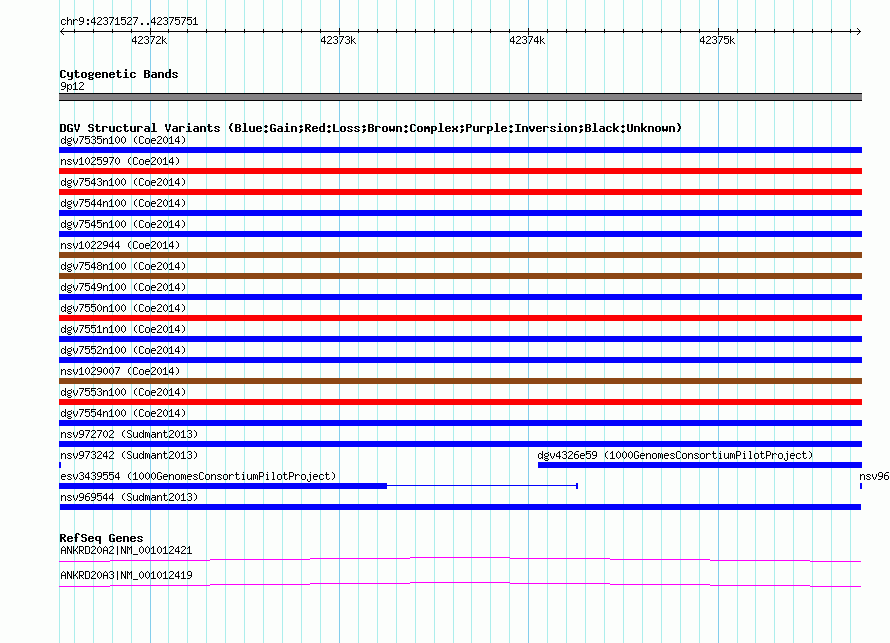 | | Variant Type | CNV duplication | | Copy Number | | | Allele State | | | Allele Origin | | | Probe Count | | | Validation Flag | | | Merged Status | M | | Merged Variants | | | Supporting Variants | nssv2727240, nssv2728092, nssv2728095, nssv2728090, nssv2728036, nssv2728093, nssv2728087, nssv2727239, nssv2727242, nssv2727243, nssv2728088, nssv2727238, nssv2728037, nssv2728094, nssv2728086, nssv2727241, nssv2727236, nssv2727237, nssv2728091, nssv2728089 | | Samples | HGDP01284, HGDP00665, HGDP00998, HGDP00521, HGDP00778, HGDP01307, HGDP00542, HGDP01029, HGDP00456, HGDP00927 | | Known Genes | ANKRD20A2, ANKRD20A3 | | Method | Sequencing | | Analysis | lineage specific fixed expansions | | Platform | Not reported | | Comments | | | Reference | Sudmant_et_al_2013 | | Pubmed ID | 23825009 | | Accession Number(s) | nsv969544