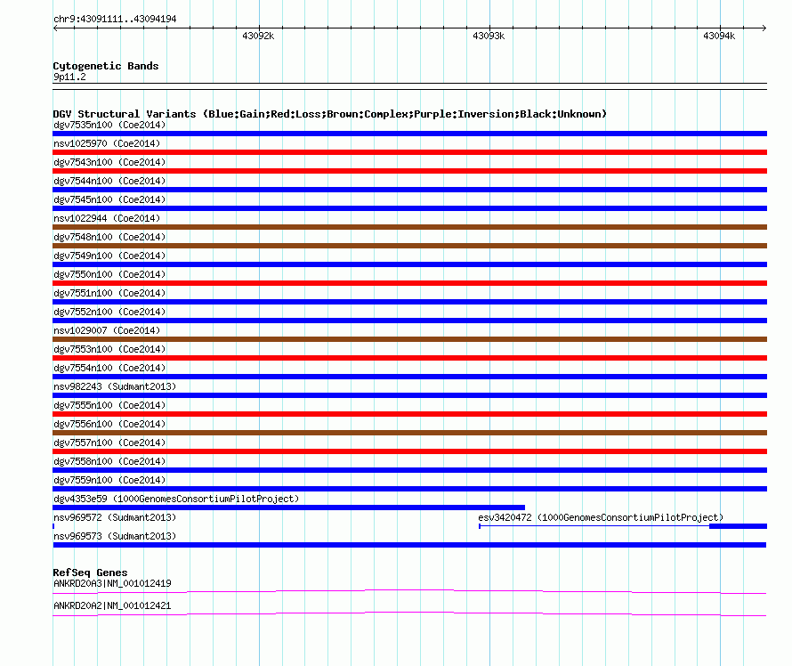 Variant DetailsVariant: nsv969573| Internal ID | 18604800 | | Landmark | | | Location Information | | | Cytoband | 9p11.2 | | Allele length | | Assembly | Allele length | | hg38 | 3079 | | hg19 | 3084 | | hg18 | 3084 |