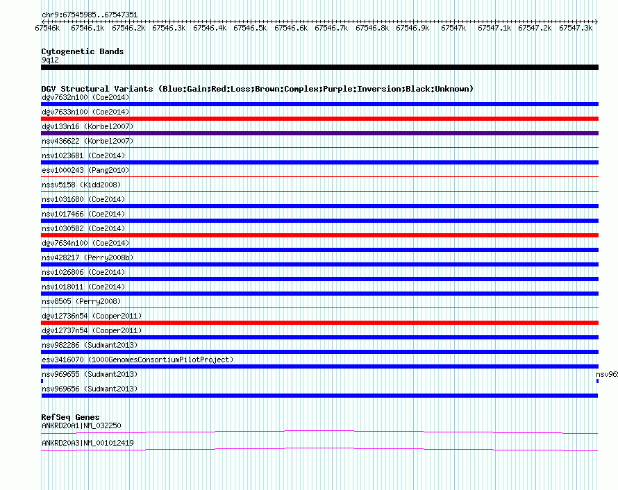 Variant DetailsVariant: nsv969656| Internal ID | 18604883 | | Landmark | | | Location Information | | | Cytoband | 9q12 | | Allele length | | Assembly | Allele length | | hg38 | 1224 | | hg19 | 1367 | | hg18 | 1367 |