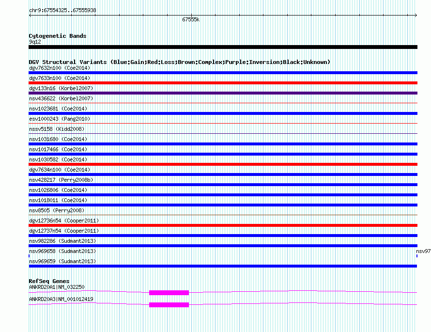 Variant DetailsVariant: nsv969659| Internal ID | 18604886 | | Landmark | | | Location Information | | | Cytoband | 9q12 | | Allele length | | Assembly | Allele length | | hg38 | 1614 | | hg19 | 1614 | | hg18 | 1614 |
