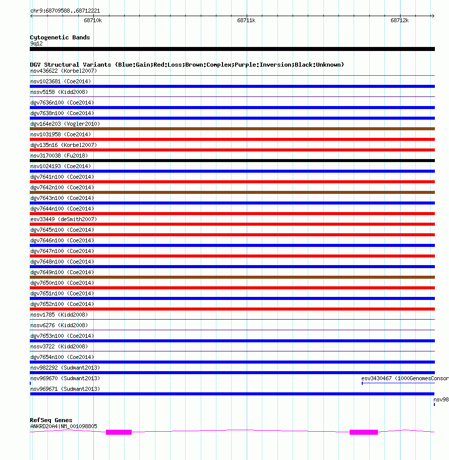 Variant DetailsVariant: nsv969671| Internal ID | 18604898 | | Landmark | | | Location Information | | | Cytoband | 9q12 | | Allele length | | Assembly | Allele length | | hg38 | 2634 | | hg19 | 2634 | | hg18 | 2634 |