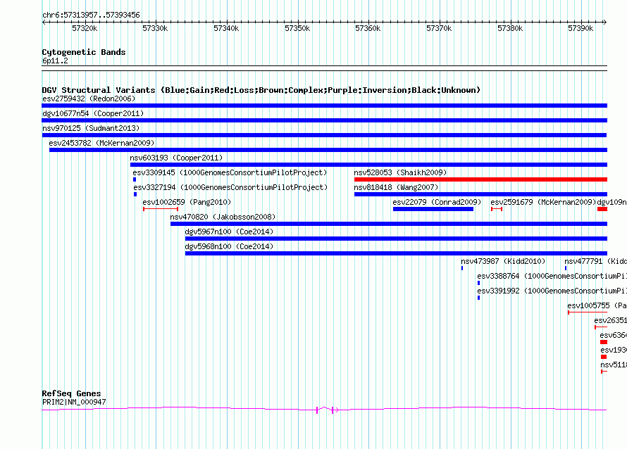 | Variant Type | CNV duplication | Copy Number | | Allele State | | Allele Origin | | Probe Count | | Validation Flag | | Merged Status | M | Merged Variants | | Supporting Variants | nssv2409008, nssv2409011, nssv2409006, nssv2409012, nssv2409009, nssv2409014, nssv2409015, nssv2409007, nssv2409010, nssv2409013 | Samples | HGDP01284, HGDP00665, HGDP00998, HGDP00521, HGDP00778, HGDP01307, HGDP00542, HGDP01029, HGDP00456, HGDP00927 | Known Genes | PRIM2 | Method | Sequencing | Analysis | lineage specific fixed duplications | Platform | Not reported | Comments | | Reference | Sudmant_et_al_2013 | Pubmed ID | 23825009 | Accession Number(s) | nsv970125