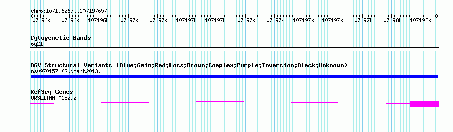 Variant DetailsVariant: nsv970157| Internal ID | 18605381 | | Landmark | | | Location Information | | | Cytoband | 6q21 | | Allele length | | Assembly | Allele length | | hg38 | 1391 | | hg19 | 1391 | | hg18 | 1391 |