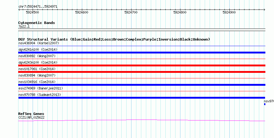 Variant DetailsVariant: nsv970788| Internal ID | 18606010 | | Landmark | | | Location Information | | | Cytoband | 7p22.1 | | Allele length | | Assembly | Allele length | | hg38 | 501 | | hg19 | 501 | | hg18 | 501 |