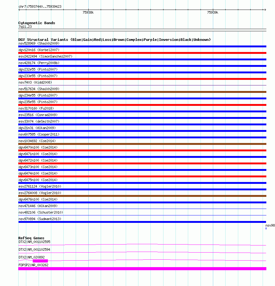 Variant DetailsVariant: nsv970894| Internal ID | 18606116 | | Landmark | | | Location Information | | | Cytoband | 7q11.23 | | Allele length | | Assembly | Allele length | | hg38 | 1984 | | hg19 | 1984 | | hg18 | 1984 |