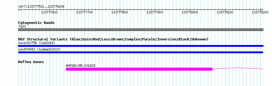 Variant DetailsVariant: nsv970943| Internal ID | 18606165 | | Landmark | | | Location Information | | | Cytoband | 7q33 | | Allele length | | Assembly | Allele length | | hg38 | 696 | | hg19 | 696 | | hg18 | 696 |