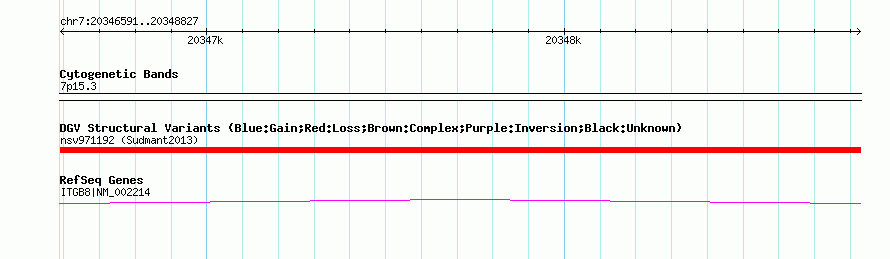 Variant DetailsVariant: nsv971192| Internal ID | 18259726 | | Landmark | | | Location Information | | | Cytoband | 7p15.3 | | Allele length | | Assembly | Allele length | | hg38 | 2237 | | hg19 | 2237 | | hg18 | 2237 |
