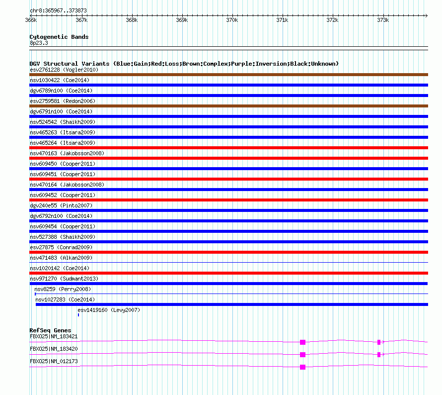 Variant DetailsVariant: nsv971270| Internal ID | 18606490 | | Landmark | | | Location Information | | | Cytoband | 8p23.3 | | Allele length | | Assembly | Allele length | | hg38 | 7907 | | hg19 | 7907 | | hg18 | 7907 |