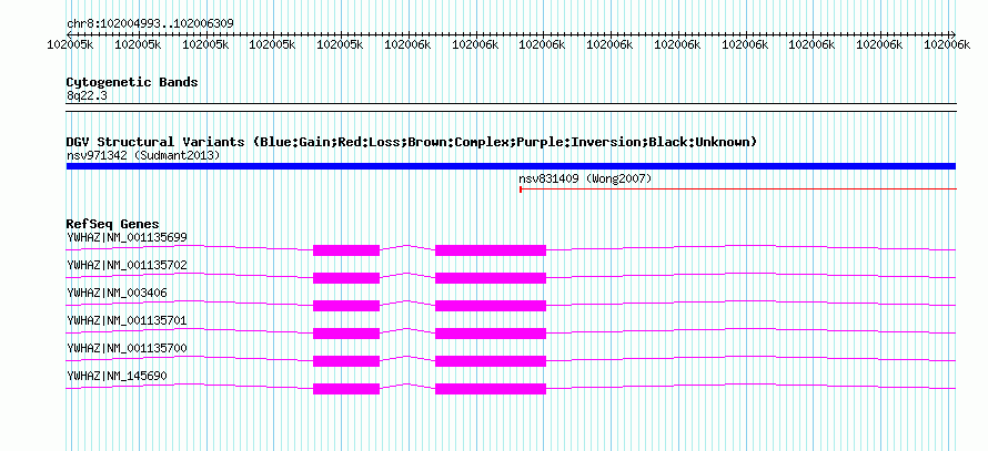 Variant DetailsVariant: nsv971342| Internal ID | 18606562 | | Landmark | | | Location Information | | | Cytoband | 8q22.3 | | Allele length | | Assembly | Allele length | | hg38 | 1317 | | hg19 | 1317 | | hg18 | 1317 |