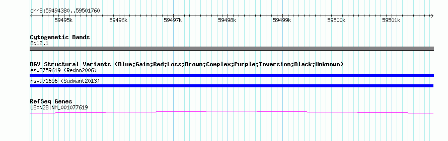 Variant DetailsVariant: nsv971656| Internal ID | 18606873 | | Landmark | | | Location Information | | | Cytoband | 8q12.1 | | Allele length | | Assembly | Allele length | | hg38 | 7381 | | hg19 | 7381 | | hg18 | 7381 |