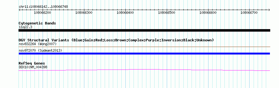Variant DetailsVariant: nsv972070| Internal ID | 18607286 | | Landmark | | | Location Information | | | Cytoband | 11q22.3 | | Allele length | | Assembly | Allele length | | hg38 | 607 | | hg19 | 607 | | hg18 | 607 |
