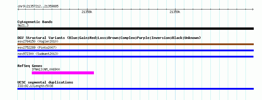 | Variant Type | CNV duplication | Copy Number | | Allele State | | Allele Origin | | Probe Count | | Validation Flag | | Merged Status | M | Merged Variants | | Supporting Variants | nssv2525006, nssv2525000, nssv2524999, nssv2525007, nssv2525008, nssv2525005, nssv2525003, nssv2525004, nssv2525001, nssv2525002 | Samples | HGDP01284, HGDP00665, HGDP00998, HGDP00521, HGDP00778, HGDP01307, HGDP00542, HGDP01029, HGDP00456, HGDP00927 | Known Genes | IFNA13 | Method | Sequencing | Analysis | lineage specific fixed duplications | Platform | Not reported | Comments | | Reference | Sudmant_et_al_2013 | Pubmed ID | 23825009 | Accession Number(s) | nsv972300