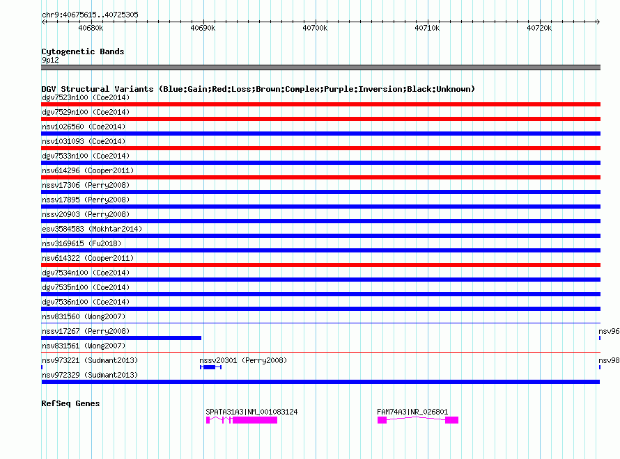 Variant DetailsVariant: nsv972329| Internal ID | 18607545 | | Landmark | | | Location Information | | | Cytoband | 9p12 | | Allele length | | Assembly | Allele length | | hg38 | 49691 | | hg19 | 49691 | | hg18 | 49691 |
