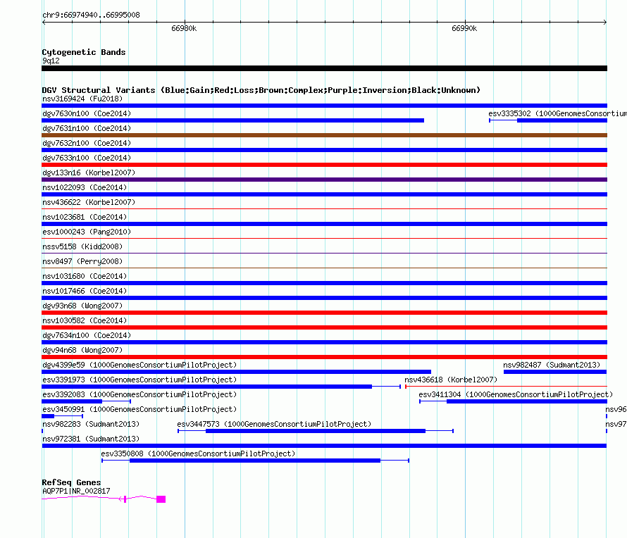 Variant DetailsVariant: nsv972381| Internal ID | 18607597 | | Landmark | | | Location Information | | | Cytoband | 9q12 | | Allele length | | Assembly | Allele length | | hg38 | 20069 | | hg19 | 20069 | | hg18 | 20069 |