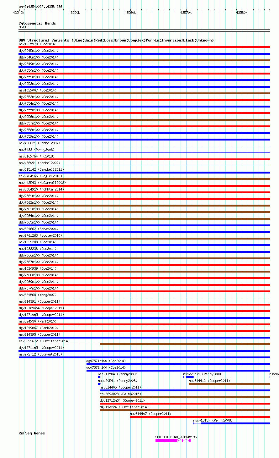 Variant DetailsVariant: nsv972712| Internal ID | 18607928 | | Landmark | | | Location Information | | | Cytoband | 9p11.2 | | Allele length | | Assembly | Allele length | | hg38 | 44616 | | hg19 | 44910 | | hg18 | 44910 |