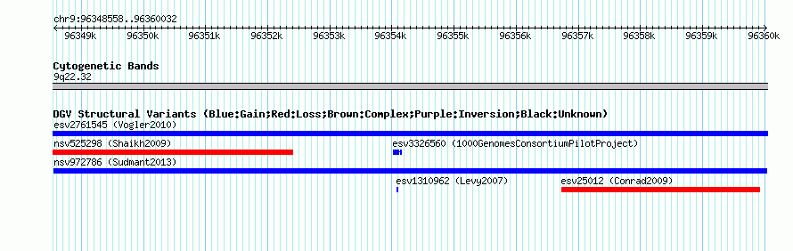 Variant DetailsVariant: nsv972786| Internal ID | 18608002 | | Landmark | | | Location Information | | | Cytoband | 9q22.32 | | Allele length | | Assembly | Allele length | | hg38 | 11475 | | hg19 | 11475 | | hg18 | 11475 |