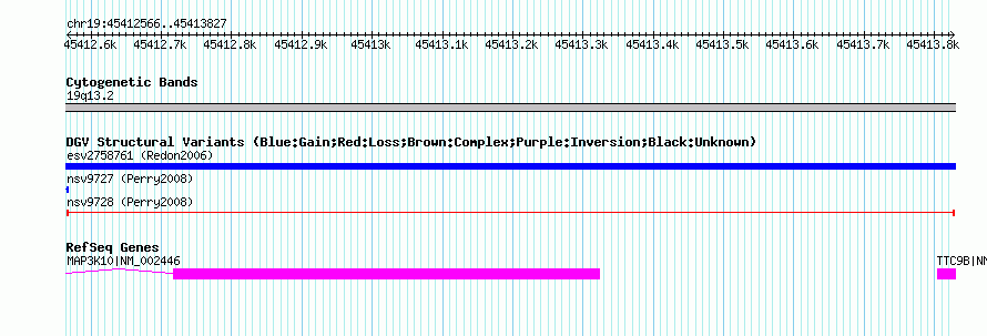 | | Variant Type | CNV loss | | Copy Number | | | Allele State | | | Allele Origin | | | Probe Count | | | Validation Flag | | | Merged Status | M | | Merged Variants | | | Supporting Variants | nssv22060, nssv23861, nssv26940, nssv25201, nssv25398, nssv24063, nssv24460 | | Samples | NA07029, NA18504, NA12802, NA18942, NA07048, NA18537, NA18564 | | Known Genes | MAP3K10, TTC9B | | Method | Oligo aCGH | | Analysis | Statistical threshold = 5.0, minimum +/- log2 ratio = 0.25 and minimum number of probes = 2 | | Platform | Agilent-015686 Custom Human 244K CGH Microarray | | Comments | | | Reference | Perry_et_al_2008 | | Pubmed ID | 18304495 | | Accession Number(s) | nsv9728