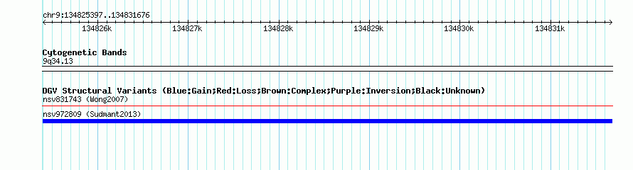 Variant DetailsVariant: nsv972809| Internal ID | 18261339 | | Landmark | | | Location Information | | | Cytoband | 9q34.13 | | Allele length | | Assembly | Allele length | | hg38 | 6280 | | hg19 | 6280 | | hg18 | 6280 |
