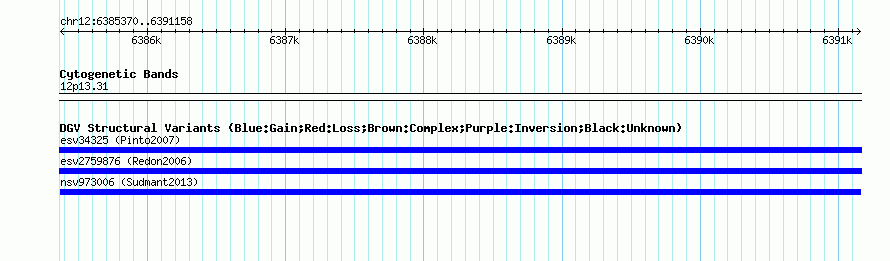Variant DetailsVariant: nsv973006| Internal ID | 18261535 | | Landmark | | | Location Information | | | Cytoband | 12p13.31 | | Allele length | | Assembly | Allele length | | hg38 | 5789 | | hg19 | 5789 | | hg18 | 5789 |