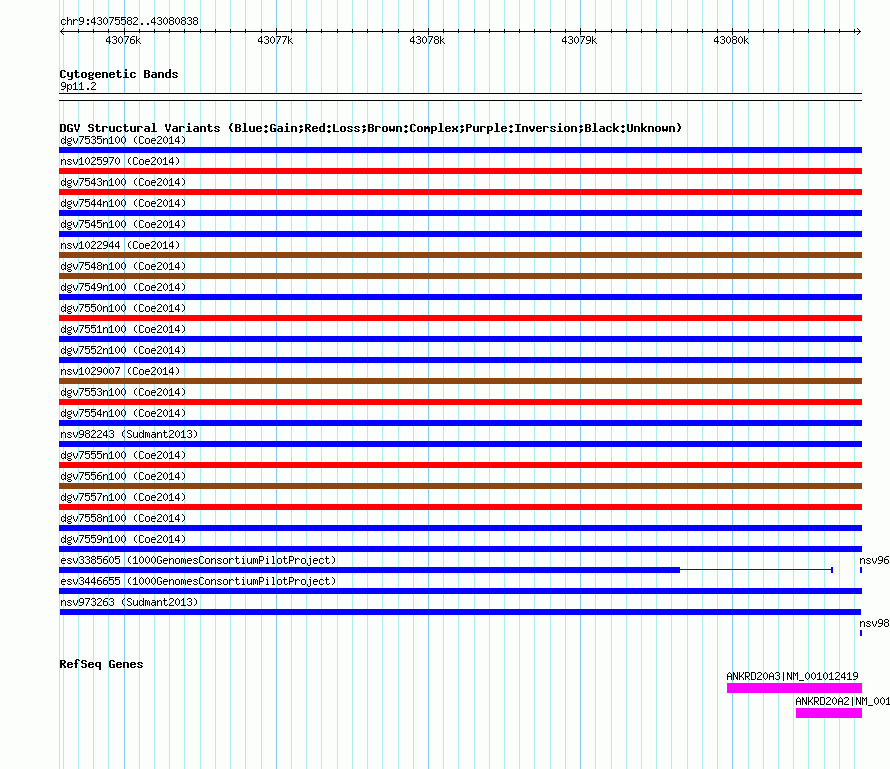 Variant DetailsVariant: nsv973263| Internal ID | 18608478 | | Landmark | | | Location Information | | | Cytoband | 9p11.2 | | Allele length | | Assembly | Allele length | | hg38 | 5259 | | hg19 | 5257 | | hg18 | 5257 |