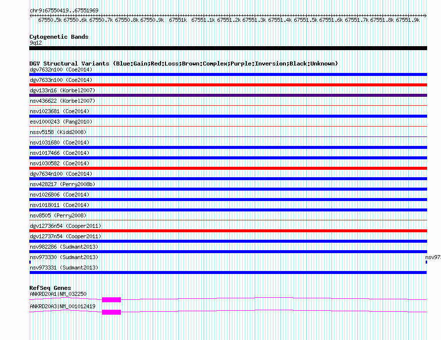 Variant DetailsVariant: nsv973331| Internal ID | 18608546 | | Landmark | | | Location Information | | | Cytoband | 9q12 | | Allele length | | Assembly | Allele length | | hg38 | 1551 | | hg19 | 1551 | | hg18 | 1551 |