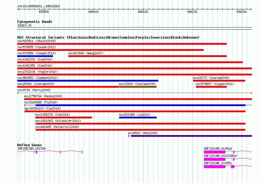 Variant DetailsVariant: nsv9734| Internal ID | 15847646 | | Landmark | | | Location Information | | | Cytoband | 19q13.31 | | Allele length | | Assembly | Allele length | | hg38 | 47242 | | hg19 | 47263 | | hg18 | 47263 | | hg17 | 47263 |