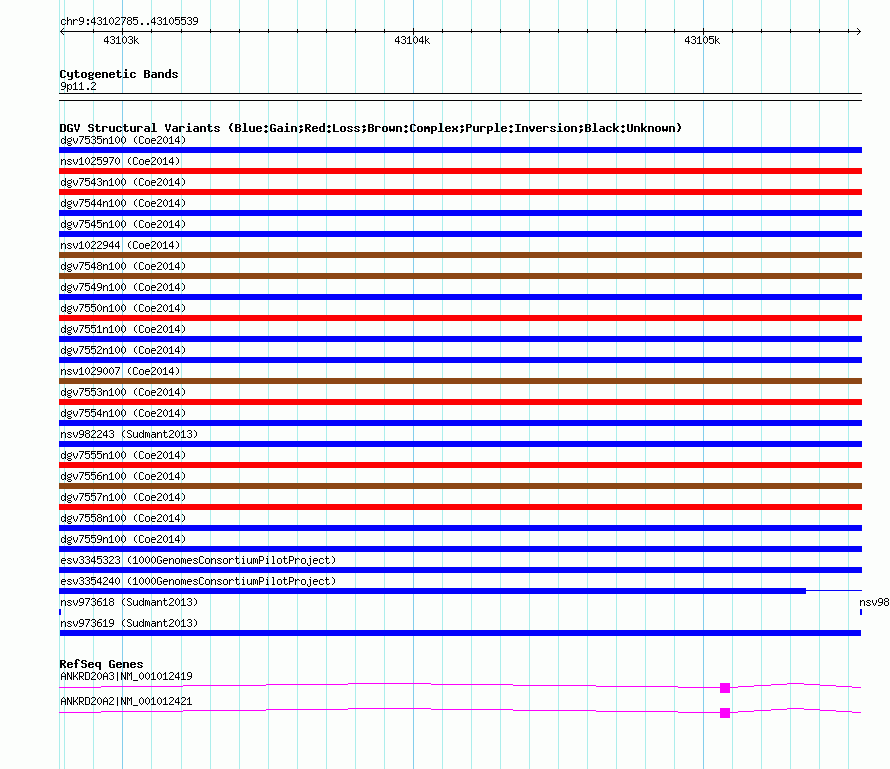 Variant DetailsVariant: nsv973619| Internal ID | 18608834 | | Landmark | | | Location Information | | | Cytoband | 9p11.2 | | Allele length | | Assembly | Allele length | | hg38 | 2755 | | hg19 | 2755 | | hg18 | 2755 |