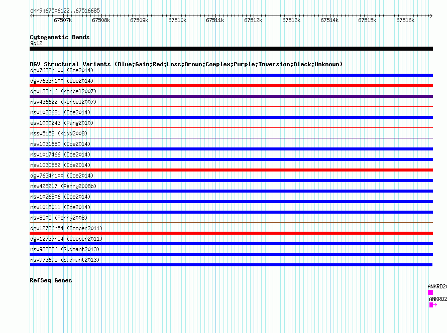 | | Variant Type | CNV duplication | | Copy Number | | | Allele State | | | Allele Origin | | | Probe Count | | | Validation Flag | | | Merged Status | M | | Merged Variants | | | Supporting Variants | nssv2739021, nssv2739025, nssv2739027, nssv2739087, nssv2739079, nssv2739886, nssv2739891, nssv2739091, nssv2739086, nssv2739885, nssv2739889, nssv2739892, nssv2739084, nssv2739029, nssv2739884, nssv2739028, nssv2739887, nssv2739083, nssv2739081, nssv2739022, nssv2739890, nssv2739088, nssv2739026, nssv2739030, nssv2739888, nssv2739024, nssv2739023, nssv2739085, nssv2739080, nssv2739082 | | Samples | HGDP01284, HGDP00665, HGDP00998, HGDP00521, HGDP00778, HGDP01307, HGDP00542, HGDP01029, HGDP00456, HGDP00927 | | Known Genes | ANKRD20A1, ANKRD20A3 | | Method | Sequencing | | Analysis | lineage specific fixed expansions | | Platform | Not reported | | Comments | | | Reference | Sudmant_et_al_2013 | | Pubmed ID | 23825009 | | Accession Number(s) | nsv973695