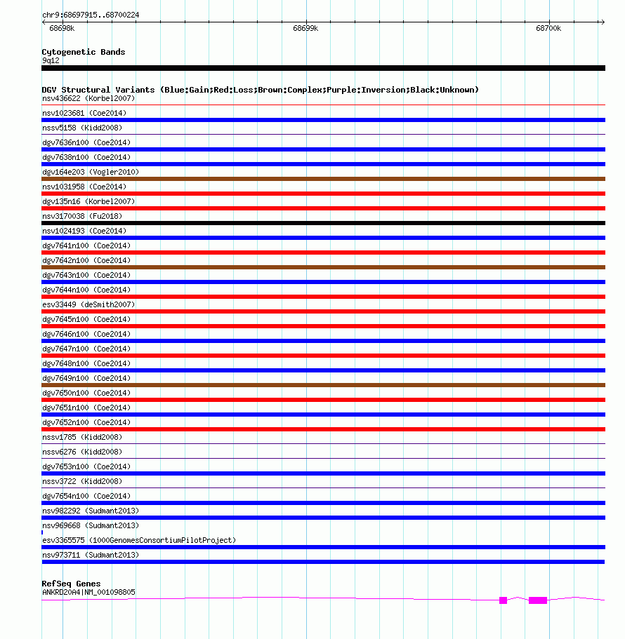 Variant DetailsVariant: nsv973711| Internal ID | 18608926 | | Landmark | | | Location Information | | | Cytoband | 9q12 | | Allele length | | Assembly | Allele length | | hg38 | 2310 | | hg19 | 2310 | | hg18 | 2310 |