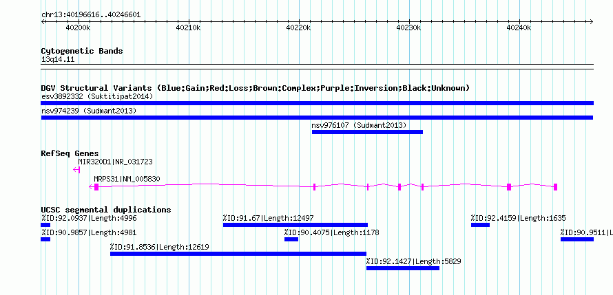 Variant DetailsVariant: nsv974239| Internal ID | 18262765 | | Landmark | | | Location Information | | | Cytoband | 13q14.11 | | Allele length | | Assembly | Allele length | | hg38 | 49986 | | hg19 | 49986 | | hg18 | 49986 |