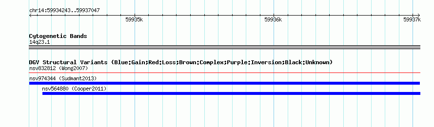 Variant DetailsVariant: nsv974344| Internal ID | 18609555 | | Landmark | | | Location Information | | | Cytoband | 14q23.1 | | Allele length | | Assembly | Allele length | | hg38 | 2805 | | hg19 | 2805 | | hg18 | 2805 |
