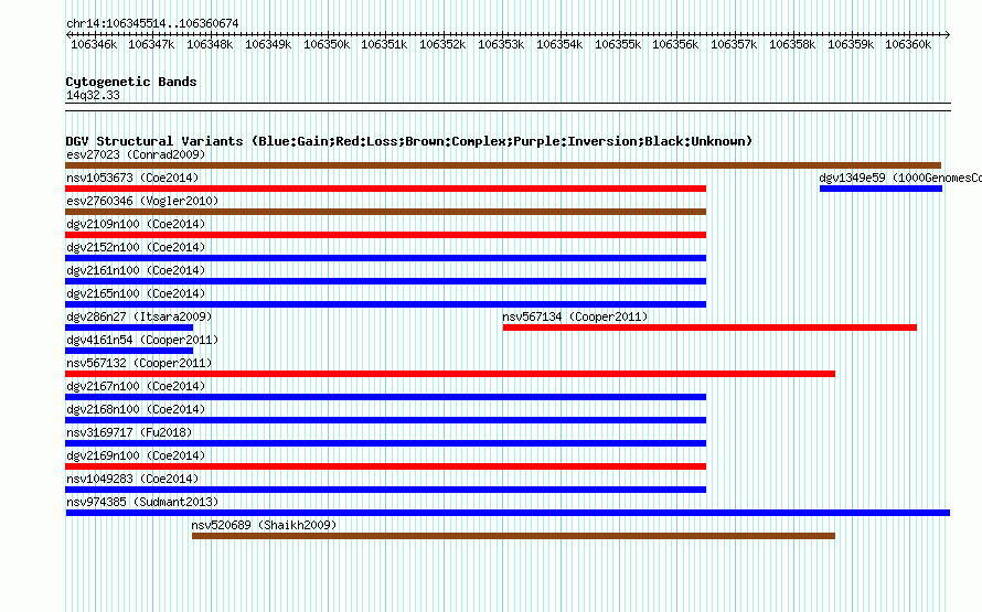 Variant DetailsVariant: nsv974385| Internal ID | 18609596 | | Landmark | | | Location Information | | | Cytoband | 14q32.33 | | Allele length | | Assembly | Allele length | | hg38 | 15097 | | hg19 | 15072 | | hg18 | 15161 |