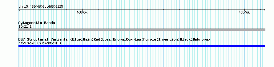 Variant DetailsVariant: nsv974570| Internal ID | 18609781 | | Landmark | | | Location Information | | | Cytoband | 15q21.1 | | Allele length | | Assembly | Allele length | | hg38 | 1520 | | hg19 | 1520 | | hg18 | 1520 |