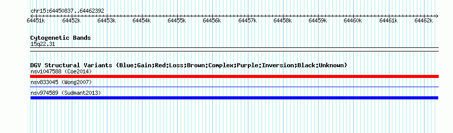 Variant DetailsVariant: nsv974589| Internal ID | 18609800 | | Landmark | | | Location Information | | | Cytoband | 15q22.31 | | Allele length | | Assembly | Allele length | | hg38 | 11556 | | hg19 | 11556 | | hg18 | 11556 |