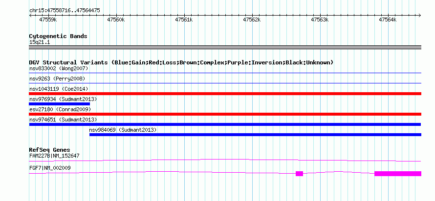 | | Variant Type | CNV duplication | | Copy Number | | | Allele State | | | Allele Origin | | | Probe Count | | | Validation Flag | | | Merged Status | M | | Merged Variants | | | Supporting Variants | nssv2627626, nssv2627628, nssv2627629, nssv2627631, nssv2627633, nssv2627630, nssv2627632, nssv2627625, nssv2627627, nssv2627634 | | Samples | HGDP01284, HGDP00665, HGDP00998, HGDP00521, HGDP00778, HGDP01307, HGDP00542, HGDP01029, HGDP00456, HGDP00927 | | Known Genes | FAM227B, FGF7 | | Method | Sequencing | | Analysis | lineage specific fixed expansions | | Platform | Not reported | | Comments | | | Reference | Sudmant_et_al_2013 | | Pubmed ID | 23825009 | | Accession Number(s) | nsv974651