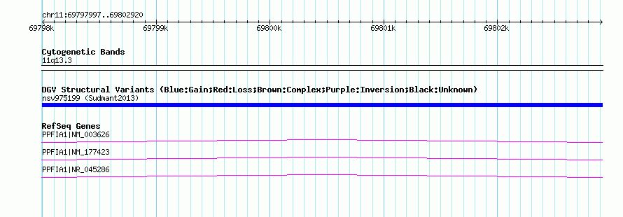 Variant DetailsVariant: nsv975199| Internal ID | 18610407 | | Landmark | | | Location Information | | | Cytoband | 11q13.3 | | Allele length | | Assembly | Allele length | | hg38 | 4924 | | hg19 | 4924 | | hg18 | 4924 |