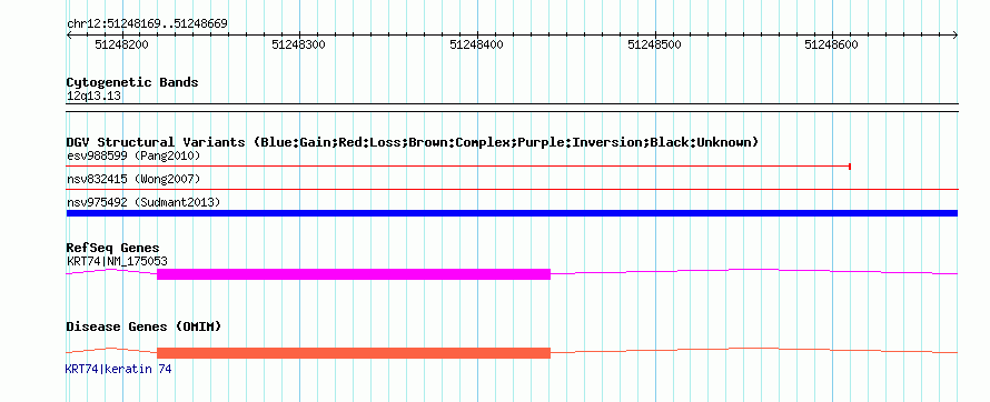 Variant DetailsVariant: nsv975492| Internal ID | 18264014 | | Landmark | | | Location Information | | | Cytoband | 12q13.13 | | Allele length | | Assembly | Allele length | | hg38 | 501 | | hg19 | 501 | | hg18 | 501 |