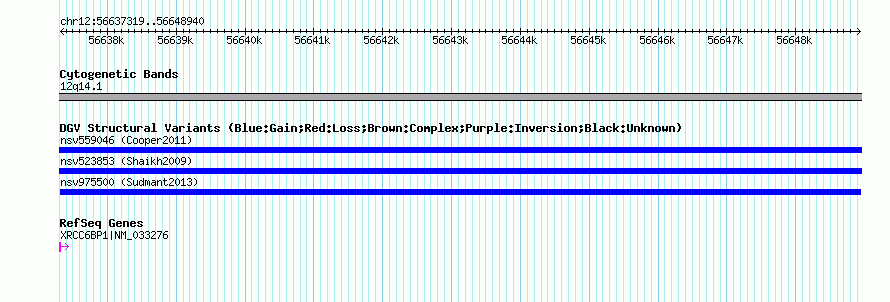 Variant DetailsVariant: nsv975500| Internal ID | 18610708 | | Landmark | | | Location Information | | | Cytoband | 12q14.1 | | Allele length | | Assembly | Allele length | | hg38 | 11622 | | hg19 | 11622 | | hg18 | 11622 |