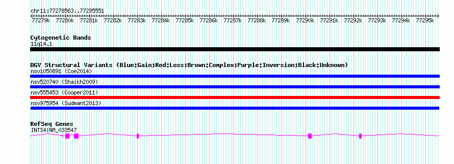 Variant DetailsVariant: nsv975954| Internal ID | 18611161 | | Landmark | | | Location Information | | | Cytoband | 11q14.1 | | Allele length | | Assembly | Allele length | | hg38 | 16989 | | hg19 | 16989 | | hg18 | 16989 |