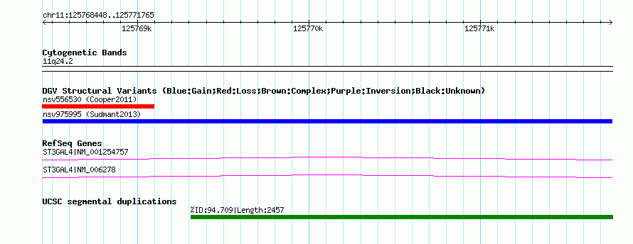 Variant DetailsVariant: nsv975995| Internal ID | 18264516 | | Landmark | | | Location Information | | | Cytoband | 11q24.2 | | Allele length | | Assembly | Allele length | | hg38 | 3318 | | hg19 | 3318 | | hg18 | 3318 |