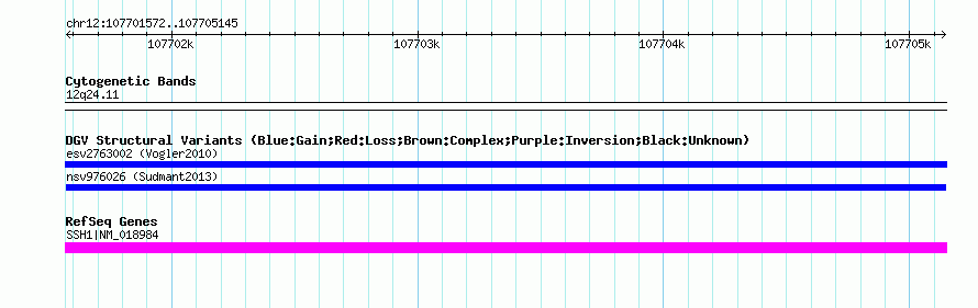 | Variant Type | CNV duplication | Copy Number | | Allele State | | Allele Origin | | Probe Count | | Validation Flag | | Merged Status | M | Merged Variants | | Supporting Variants | nssv2762737 | Samples | HGDP00998 | Known Genes | SSH1 | Method | Sequencing | Analysis | Human CNVs | Platform | Not reported | Comments | | Reference | Sudmant_et_al_2013 | Pubmed ID | 23825009 | Accession Number(s) | nsv976026