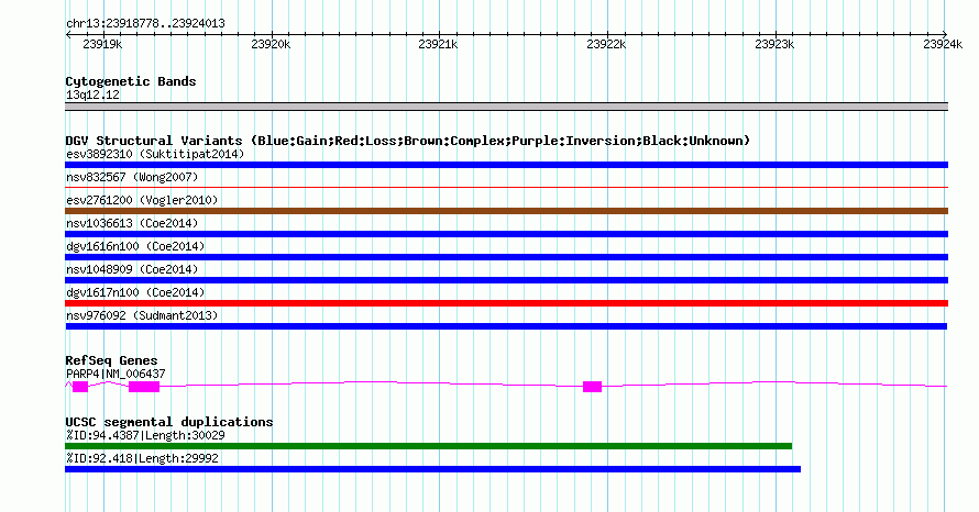 Variant DetailsVariant: nsv976092| Internal ID | 18264613 | | Landmark | | | Location Information | | | Cytoband | 13q12.12 | | Allele length | | Assembly | Allele length | | hg38 | 5236 | | hg19 | 5236 | | hg18 | 5236 |