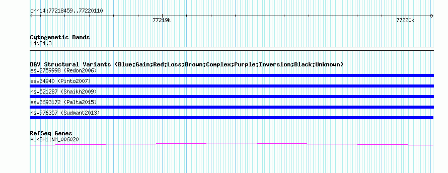 Variant DetailsVariant: nsv976357| Internal ID | 18611563 | | Landmark | | | Location Information | | | Cytoband | 14q24.3 | | Allele length | | Assembly | Allele length | | hg38 | 1652 | | hg19 | 1652 | | hg18 | 1652 |